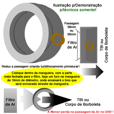 Como tem a função de mesclar o GNV com o AR através do turbilhonamento causado na passagem por ele, tanto pela redução como pelo ângulo da passagem, deve-se ter em mente que o correto posicionamento do mesmo e as dimensões mais adequadas a cada veículo para sua respectiva motorização otimizam os resultados.